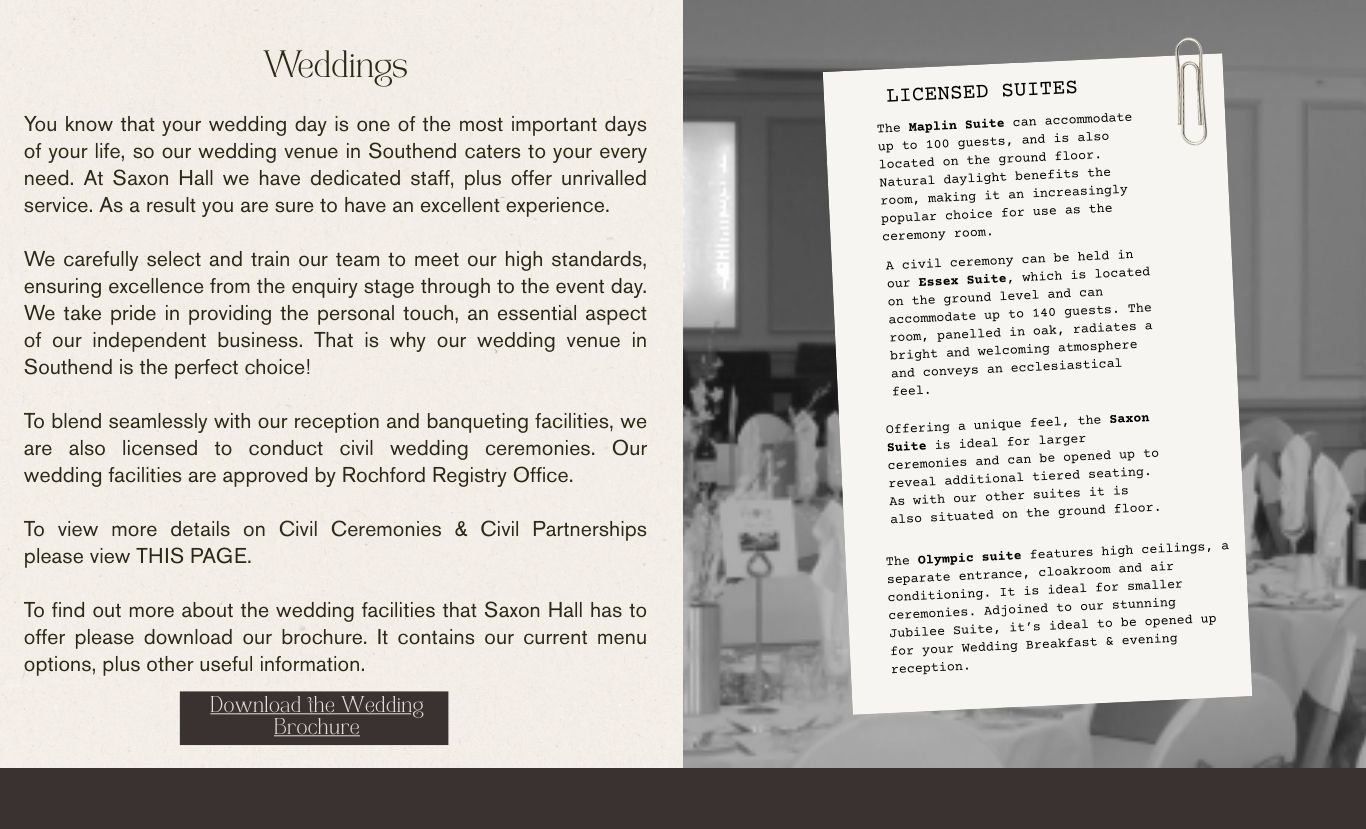 read moreAt Saxon Hall we have a room for every occasion whether it is a black tie banquet for up to 200 people or a simple business meeting for just two or three. Our latest Jubilee Suite with its stunning decor and outside Garden is also a popular choice for wedding receptions. We are in the business of making your next event as successful and memorable as possible at an affordable price. Top service and good food are also an essential part of the package. For large events, the Clifftown and Shorefield suites can be joined to form a large meeting room with a capacity for up to 230 people.
